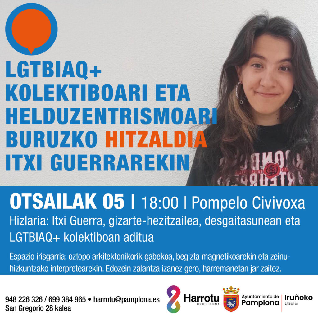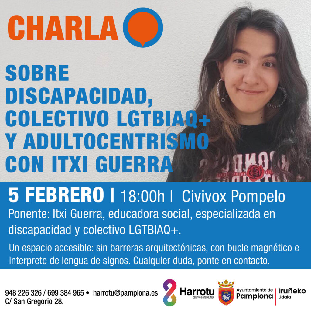 Harrotu, el servicio público LGTBIAQ+ de Iruña-Pamplona, ha organizado la charla ‘Discapacidad, colectivo LGTBIAQ+ y adultocentrismo’. Mediante esa charla se buscarán todos aquellos hilos que entrelazan a lo discapacitado y a lo queer, no como realidades separadas que en algún momento se juntan o coinciden en lo que se nombra como la doble o triple opresión, sino como dos caras de la misma moneda. Dos realidades compartidas: la ruptura de la norma y la (des)patologización. La charla será impartida por Itxi Guerra.