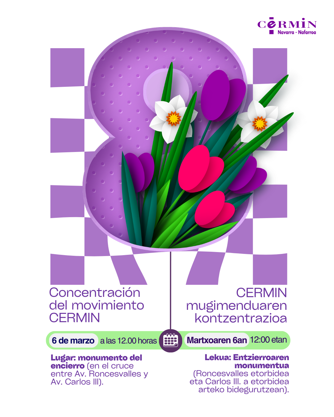 El movimiento asociativo CERMIN vuelve a concentrarse con motivo del Día Internacional de las Mujeres. Una concentración para reivindicar la igualdad y visibilizar los derechos de las mujeres y niñas con discapacidad, madres y cuidadoras, y poner sobre la mesa sus reivindicaciones y necesidades específicas.  Durante el acto se leerá el manifiesto con motivo del 8M y próximamente compartiremos más información sobre las actuaciones culturales que nos acompañarán esa mañana.