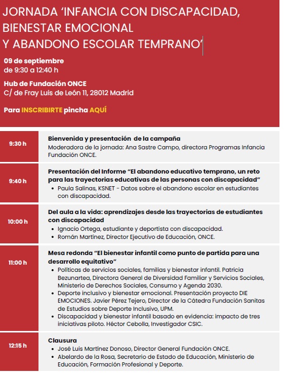 Inscripción en el siguiente enlace: https://www.fundaciononce.es/es/evento/jornada-infancia-con-discapacidad-bienestar-emocional-y-abandono-escolar-temprano