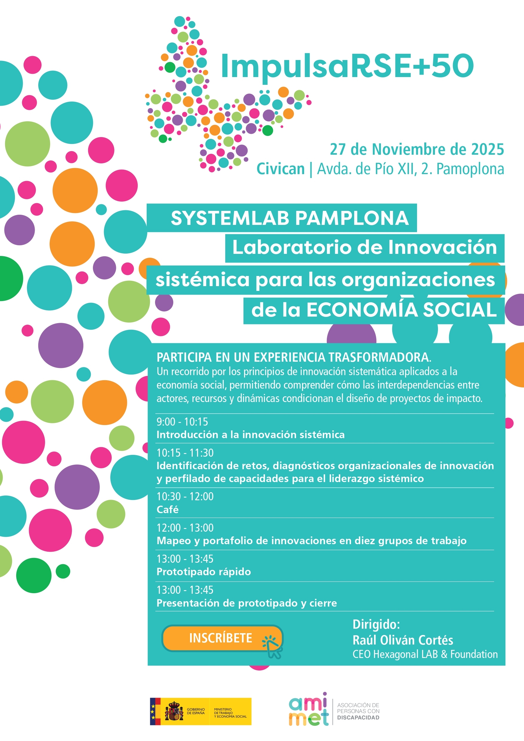 El próximo 27 de noviembre, AMIMET ha organizado la Jornada SystemLab Pamplona para explorar retos reales, identificar oportunidades y co-crear soluciones que impulsen alianzas empresariales inclusivas y fortalezcan el empleo de personas mayores de 50 años en la economía social. Es un laboratorio intensivo de innovación sistémica del proyecto estatal ImpulsaRSE+50, desarrollado por AMIMET y financiado por el Ministerio de Trabajo y Economía Social y de la mano del experto en innovación social Raúl Oliván.
