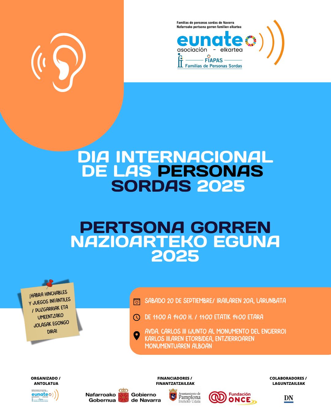 La Asociación de Familias de Personas Sordas de Navarra – Eunate tiene el placer de invitarte a participar en la celebración del Día Internacional de las Personas Sordas 2025, que tendrá lugar el sábado 20 de septiembre, de 11:00 a 14:00 horas, en la Avenida Carlos III de Pamplona (junto al monumento al encierro). Será una […]