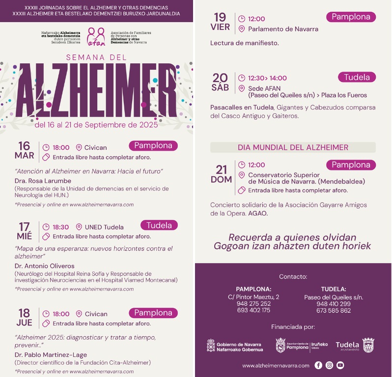 Desde AFAN (Asociación de Familiares de personas con Alzheimer de Navarra) han organizado la XXXIII Jornadas sobre el Alzheimer y otras demencias del 16 al 21 de septiembre con actividades en Pamplona y Tudela con el objetivo de dar visibilidad y acompañar a las familias cuidadoras en el Día Mundial del Alzheimer. Programa de la semana: