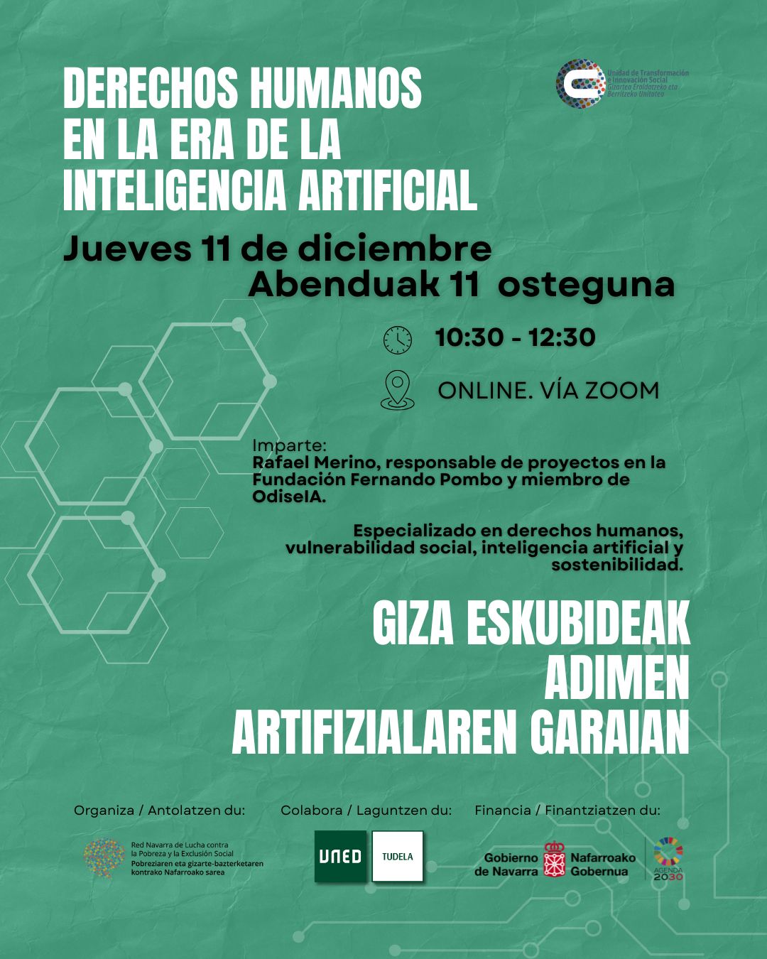 La Red Navarra de Lucha contra la Pobreza y la Exclusión Social ha organizado el seminario online: “Derechos Humanos en la era de la Inteligencia Artificial”, que tendrá lugar el 11 de diciembre a las 10:30. Una jornada organizada en colaboración con UNED Tudela y se impartirá de manera online.