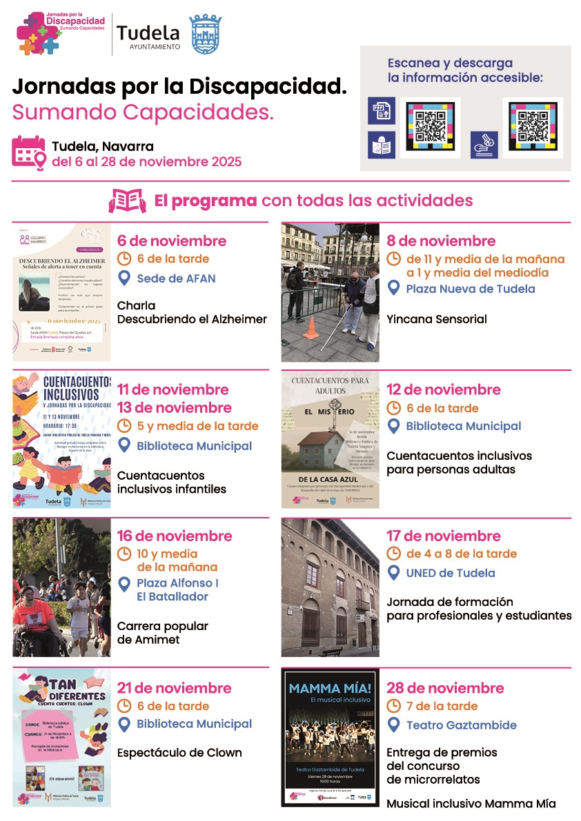 Del 6 al 28 de noviembre se celebrarán en distintos espacios de la ciudad de Tudela las V Jornadas de la Discapacidad. Bajo el lema “Sumando capacidades”, esta iniciativa busca dar a conocer las habilidades y aportaciones de las personas con discapacidad en la Ribera de Navarra, fomentar su inclusión, mejorar su calidad de vida y promover una sociedad más accesible e inclusiva, que comprenda mejor sus necesidades y valore su participación activa.